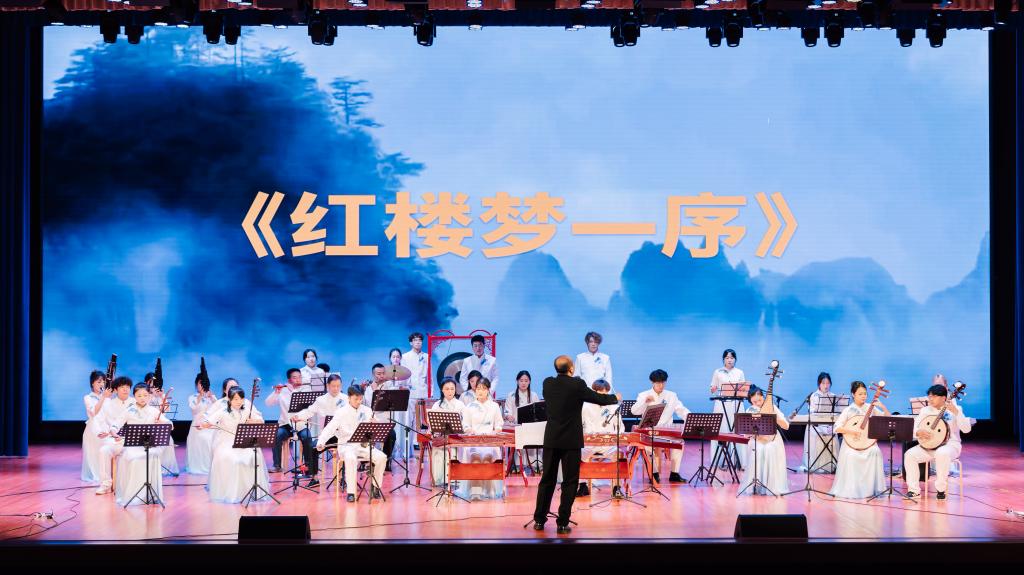 演出在民族管弦乐《红楼梦—序》《上元节》的悠扬旋律中拉开帷幕。整场晚会以“红色记忆永流传”“时代浪潮展风采”“同心共筑中国梦”三大篇章为主线,通过15个精品节目串联起党的百年奋斗史诗。女生小合唱《映山红》以深情歌声唤醒革命记忆,古筝合奏《绣金匾》用弦音传递人民对老一辈革命家的深切缅怀;舞蹈《远古的呼唤》与情景剧《满江红》则分别以跨越时空的艺术语言,展现中华文明的厚重底蕴和民族英雄的赤胆忠心。