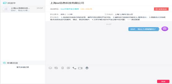 一是主动在“新入场求职者”标签下,浏览入场求职人员简历,点击“立即洽谈”对意向洽谈人员发出沟通申请,并进行面试洽谈。如下图: