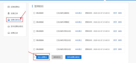 2. 企业通过后台中心“网络招聘会”栏目——点击发布招聘会职位(等待审核)——审核通过后,将“招聘会职位库”中的职位加入到“太阳成集团tyc122ccvip2021年冬季高校毕业生网络视频双选会”,职位将在网络招聘大厅中进行展示。