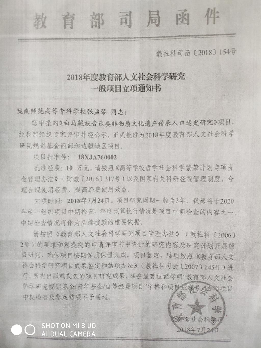 6月28日,2018年度教育部人文社会科学研究西部和边疆地区项目评审结果公示,公司太阳成集团tyc122ccvip教授张益琴申报的《白马藏族音乐类非物质文化遗产传承人口述史研究》获得规划基金项目立项,这是公司首次获得教育部科研项目。该项目获批资助10万元,2021年结项。