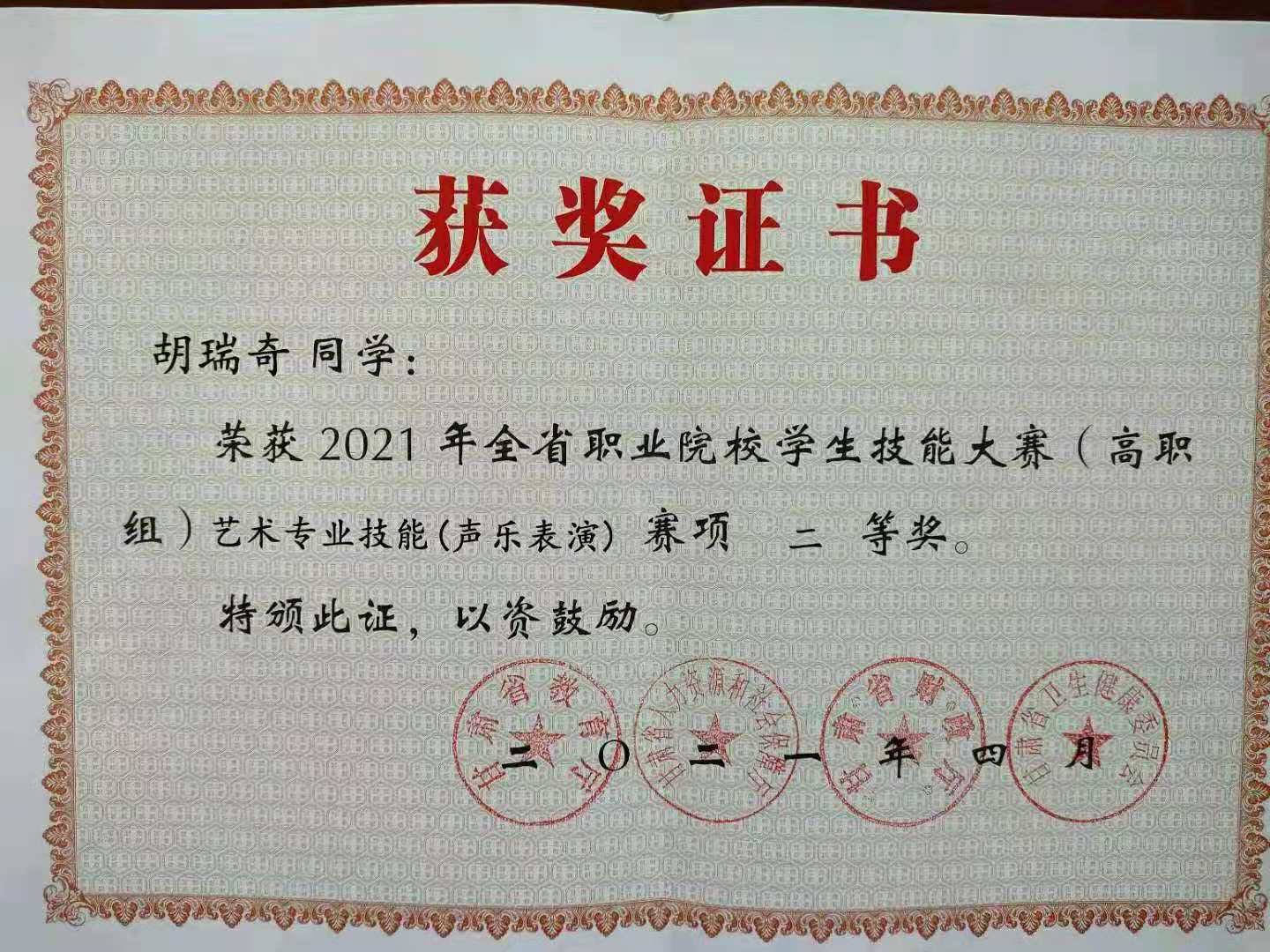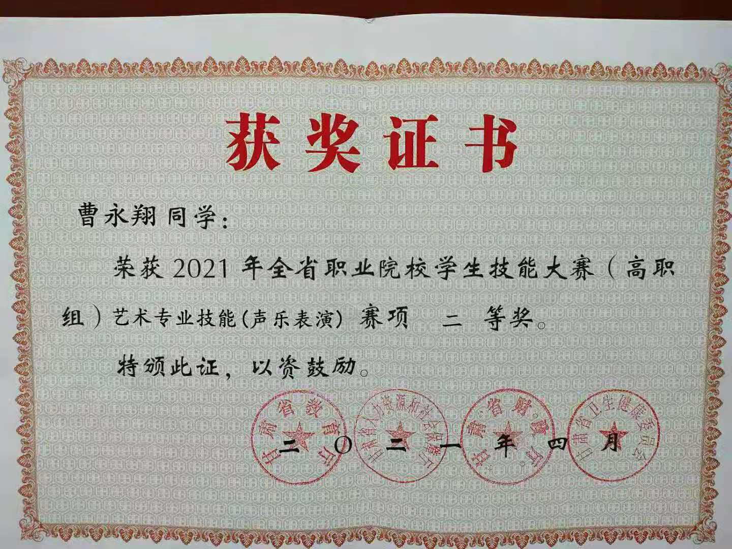 41921日,甘肃省高等职业院校职业技能竞赛声乐表演项目在兰州职业技术公司进行,公司员工曹永翔、张保利、胡瑞琦三名员工在周新美经理带领下,与指导教师杨欢、艺术指导刘光华一行赴兰州职业技术公司参加了声乐表演项目竞赛,经过三轮激烈的竞争,最终三名选手全部荣获二等奖。